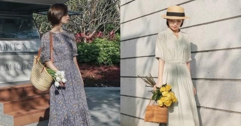 休閒連身洋裝配上白色少女風的包頭跟鞋,配上同色系的包包,乍看還以為是哪位鄰家女孩呢~